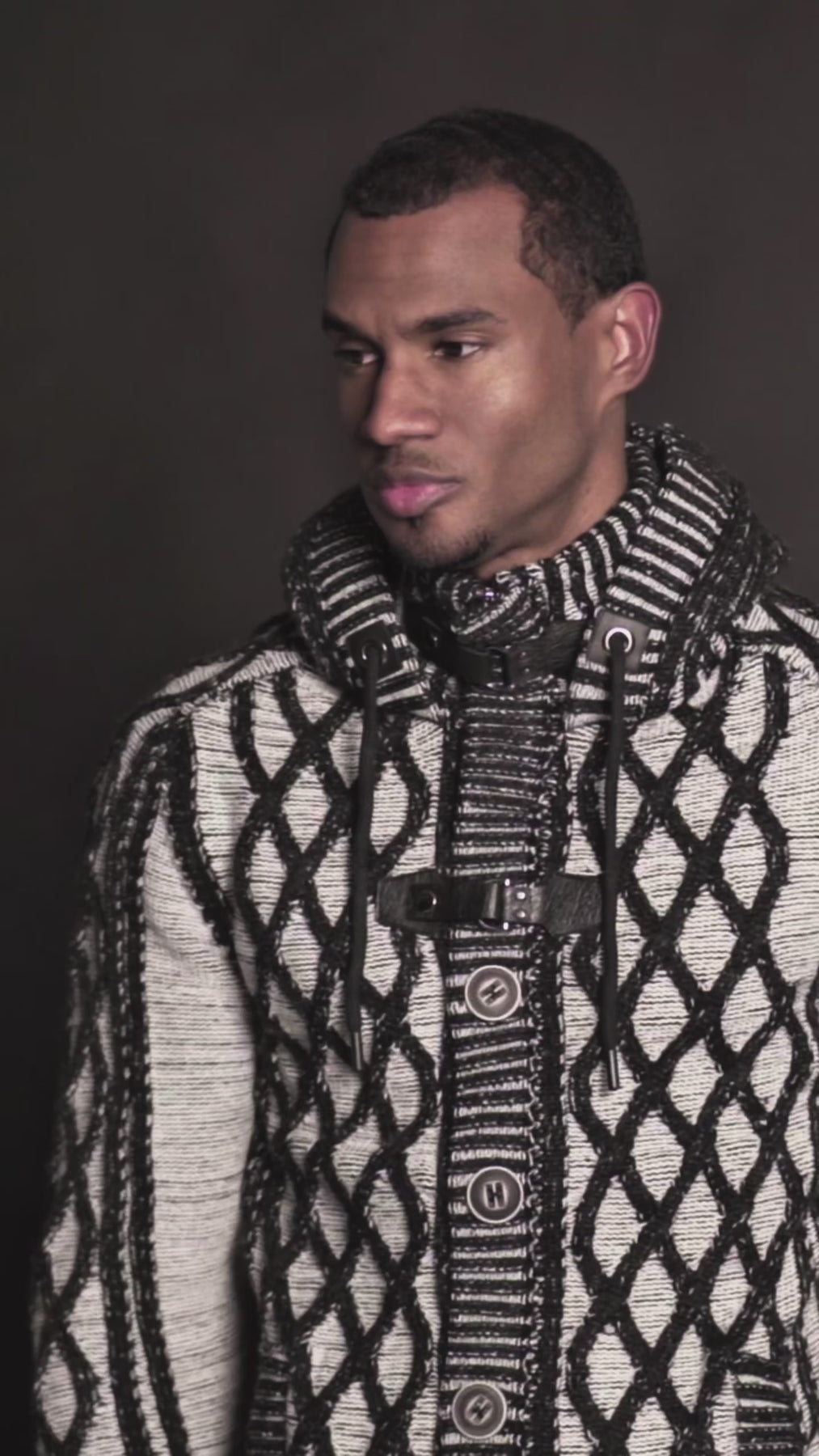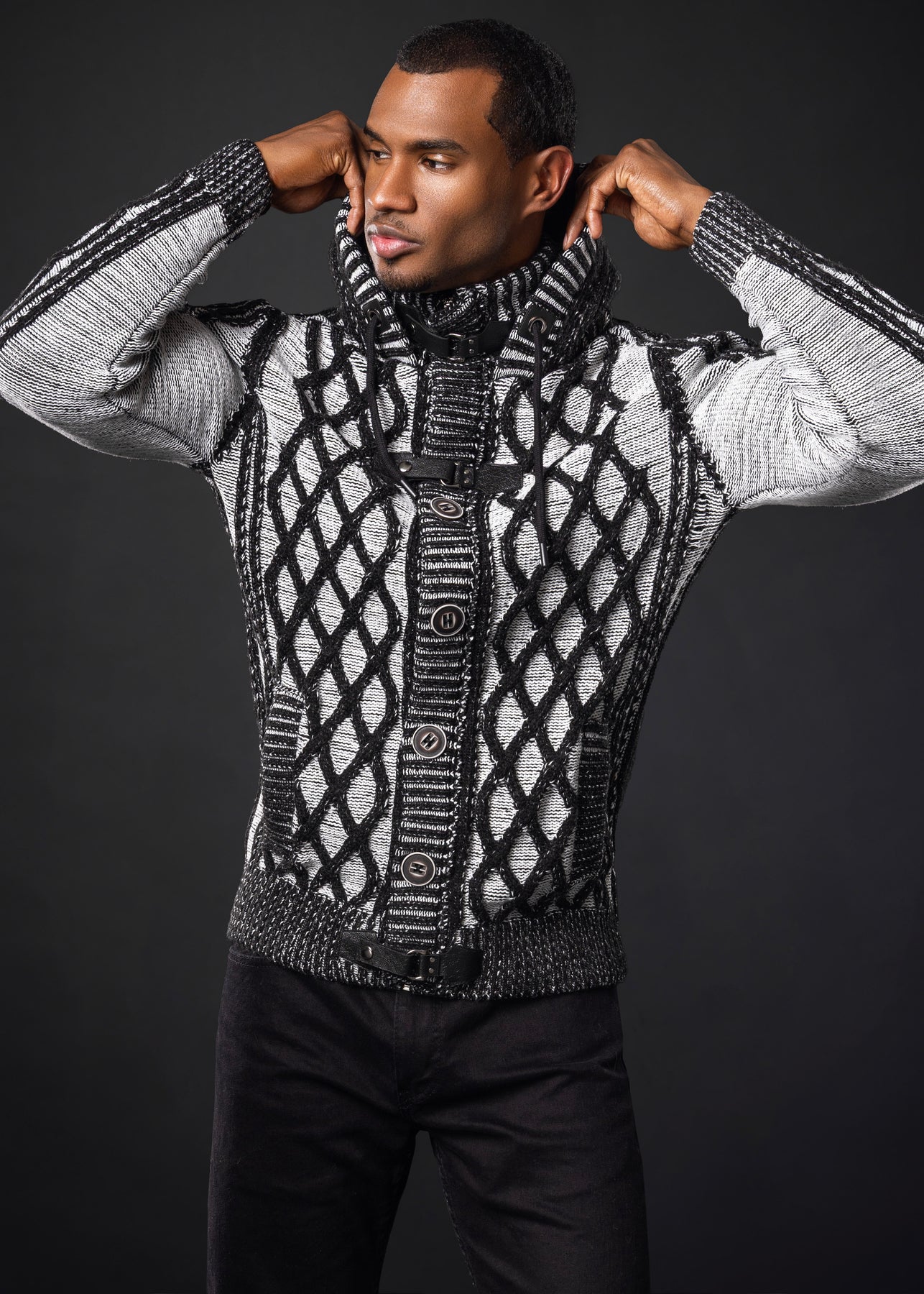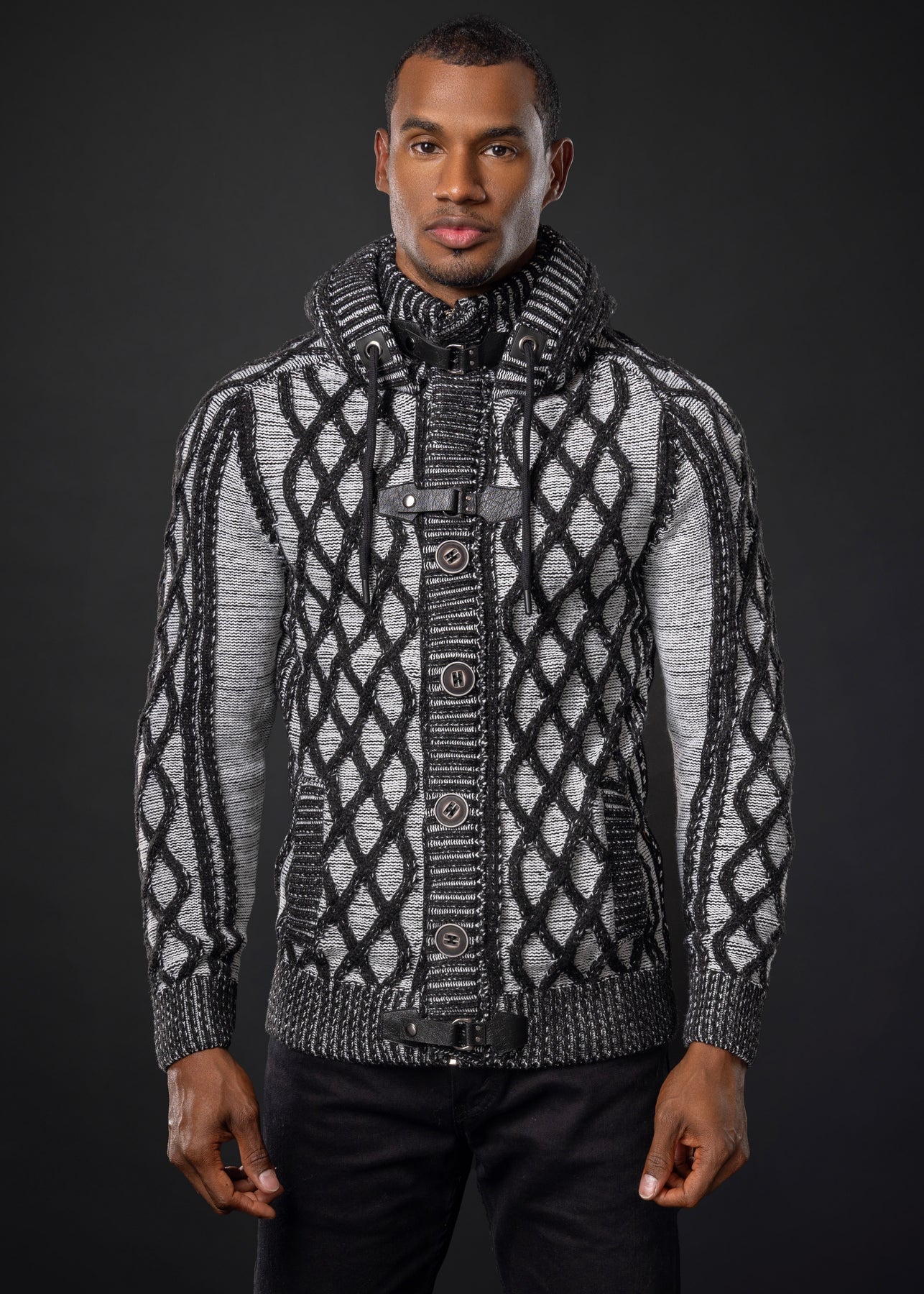 The black/grey 'Axis' hoody is crafted from a dual-tone cable and diamond-knit pattern, it reflects both texture and restraint