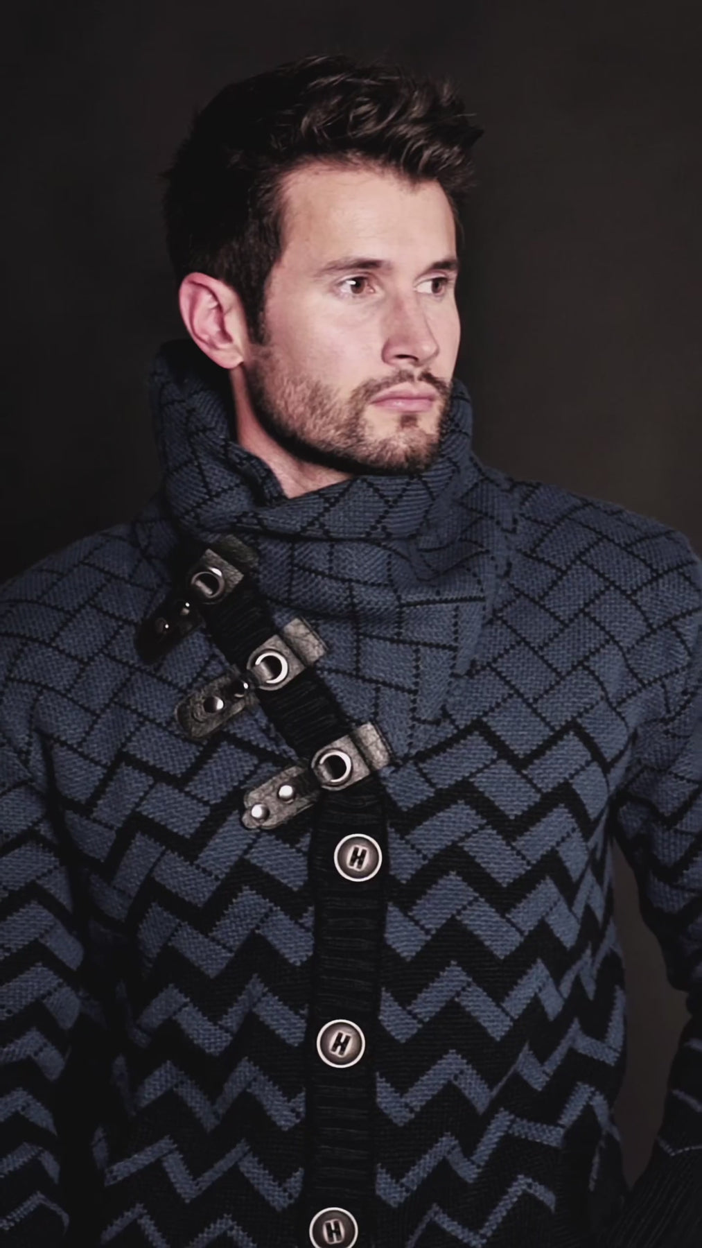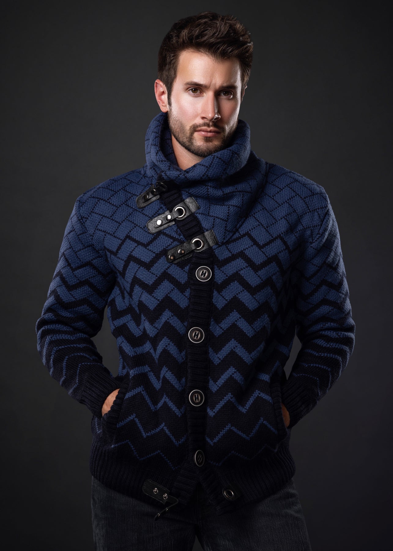 Features: Textured chevron knit in gradient blue and navy; contoured fit for a clean, masculine profile